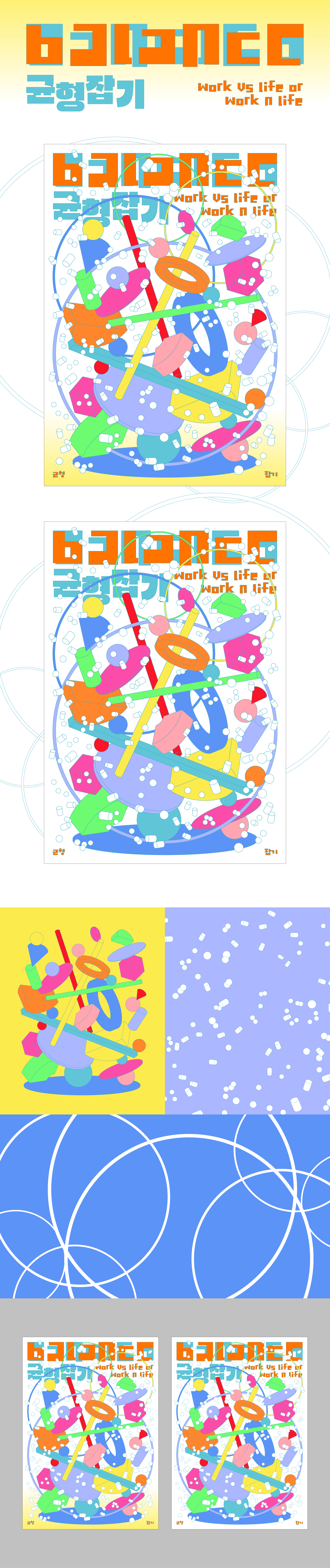 균형을 주제로 한 포스터 디자인 작업을 진행하였습니다. 정리되지 않은 일상의 단편들과 그 안에서 형성되는 상태적 균형을 출발점으로 삼아, 서로 다른 형태와 색을 가진 요소들이 충돌하고 부유하는 장면을 시각적으로 구성하였습니다.