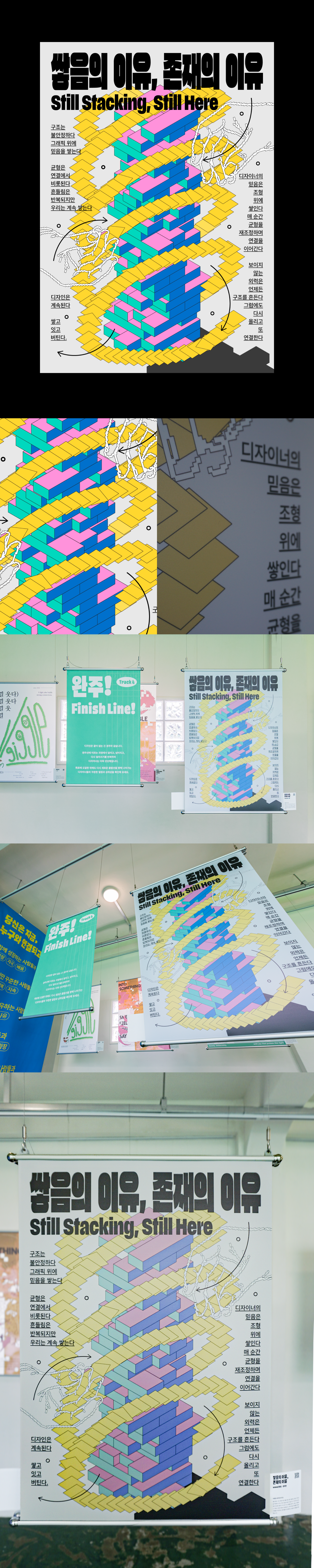 불안정한 구조 위에 무언가를 계속 쌓아올리는 일은, 어쩌면 디자인을 계속해나가는 나의 모습과 닮아 있습니다. 디자이너의 믿음은 완성된 결과가 아니라, 쌓기와 연결의 반복 속에서 생겨납니다. 젠가처럼 위태롭게 쌓인 조형물은 ‘나’와 ‘믿음’의 형상화이며, 그 위를 회전하는 종이들은 ‘흐름’과 ‘연결’을 상징함과 동시에, 고립되어 있는 디자이너들이 서로 작업을 나누고 소통할 수 있는 ‘창구’로서의 기능을 표현했습니다. 보이지 않는 외부의 흔들림에도 디자이너는 균형을 다시 맞추고, 또다시 쌓고, 계속 연결합니다. 이 불안한 반복 속에서도 ‘계속 할 수 있다’는 믿음은 결국 단단한 조형물이 되어 우리를 버티게 합니다. ‘쌓음의 이유, 존재의 이유’는 거창한 확신이 아닌, 매번 쌓고 다시 이어가며 자신을 증명하고자 하는 의지에서 출발합니다. 그 끈질긴 믿음의 반복을 이어가는 디자이너들의 노력을 믿습니다.